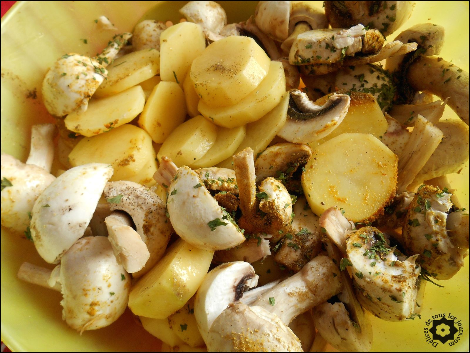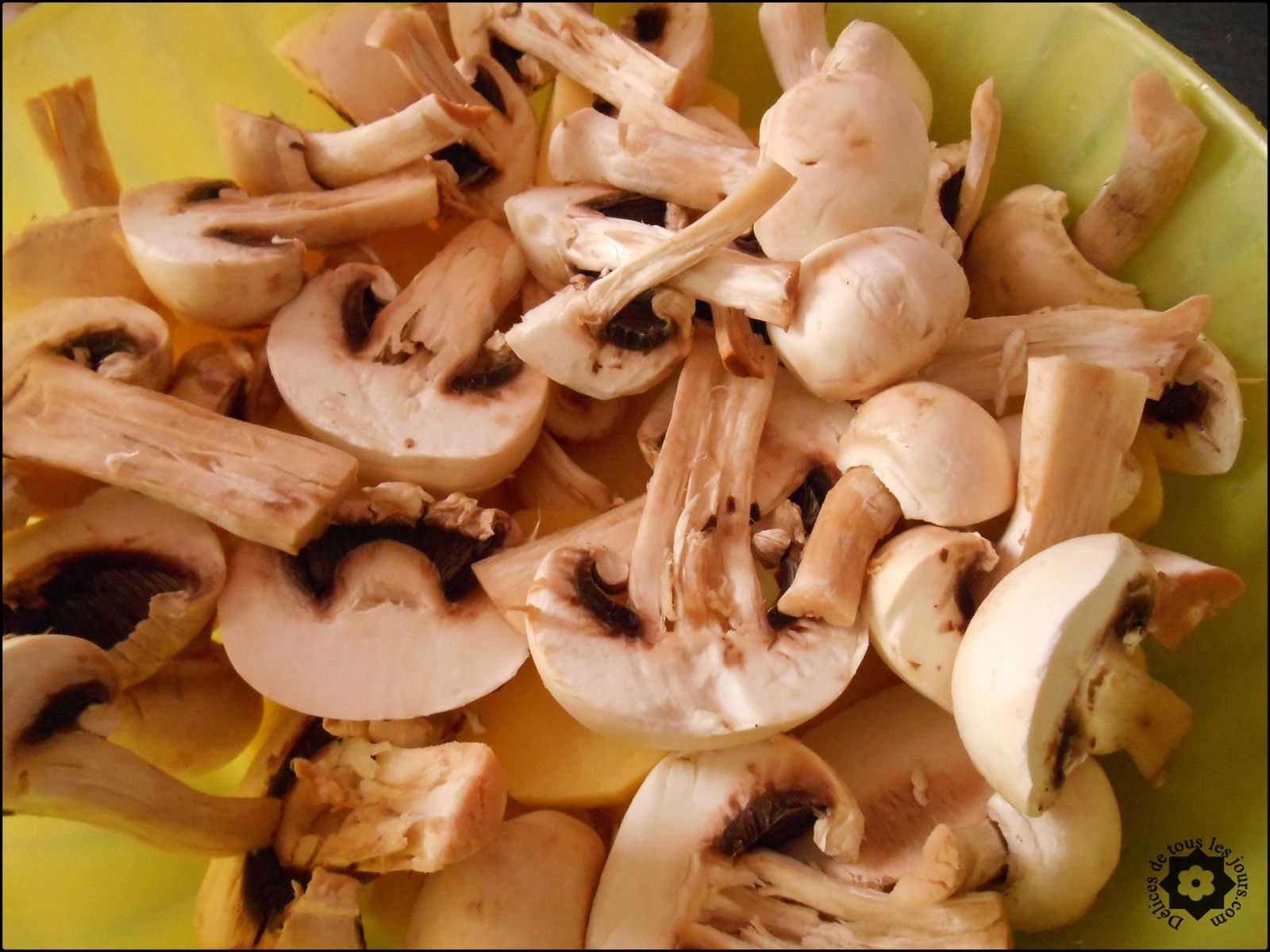 Lavez et épluchez les pommes de terre, lavez aussi les champignons, coupez le tout (pommes de terre en rondelles assez grosses et champignons en lamelles).