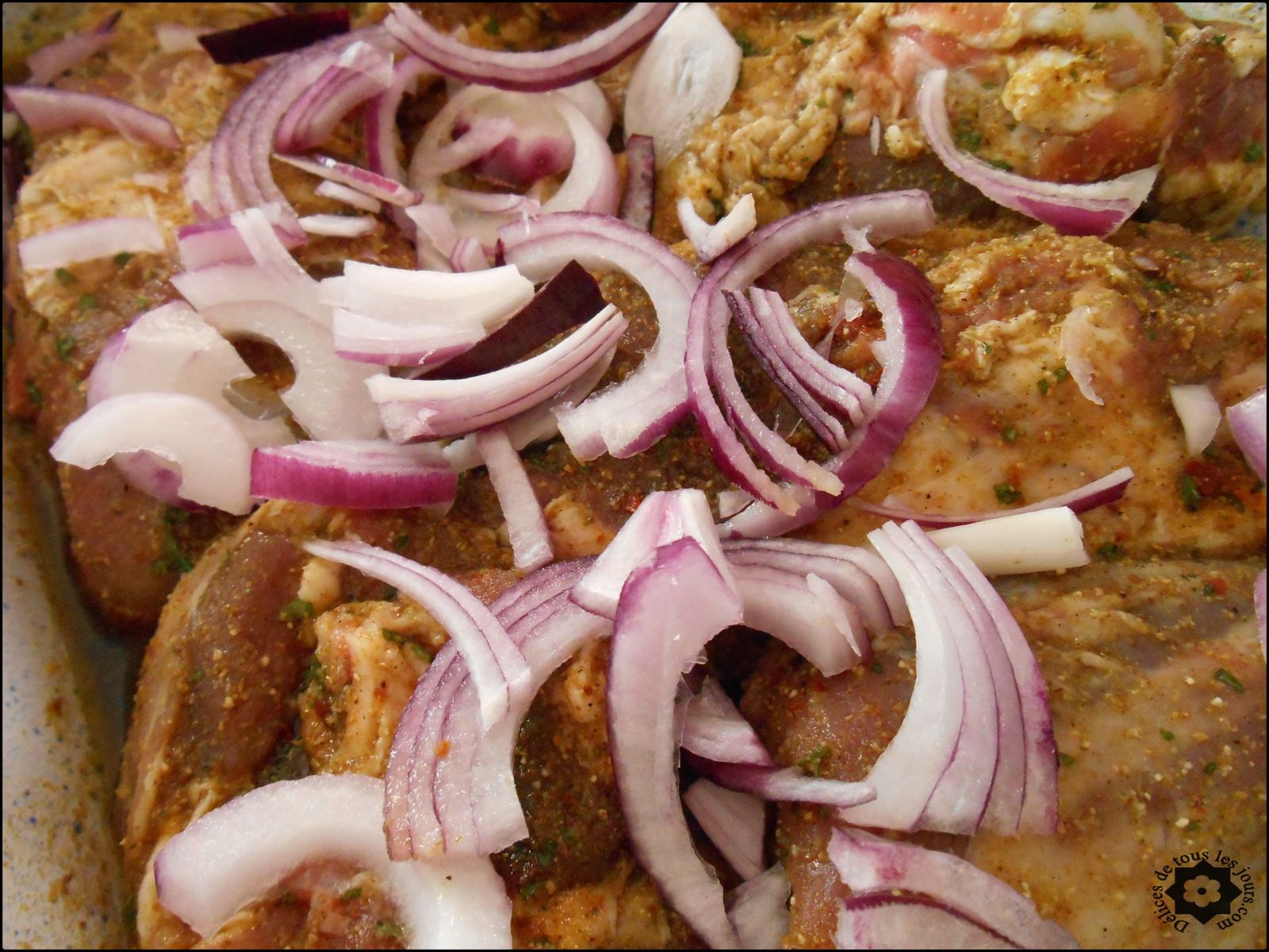 Dans un grand plat installez la viande et arrosez la de toute la marinade, aidez vous d'un pinceau pour bien faire entrer les épices de partout et n'oubliez pas d'incisez vos morceaux de viande par ci et par là pour que tout soit imprégné.