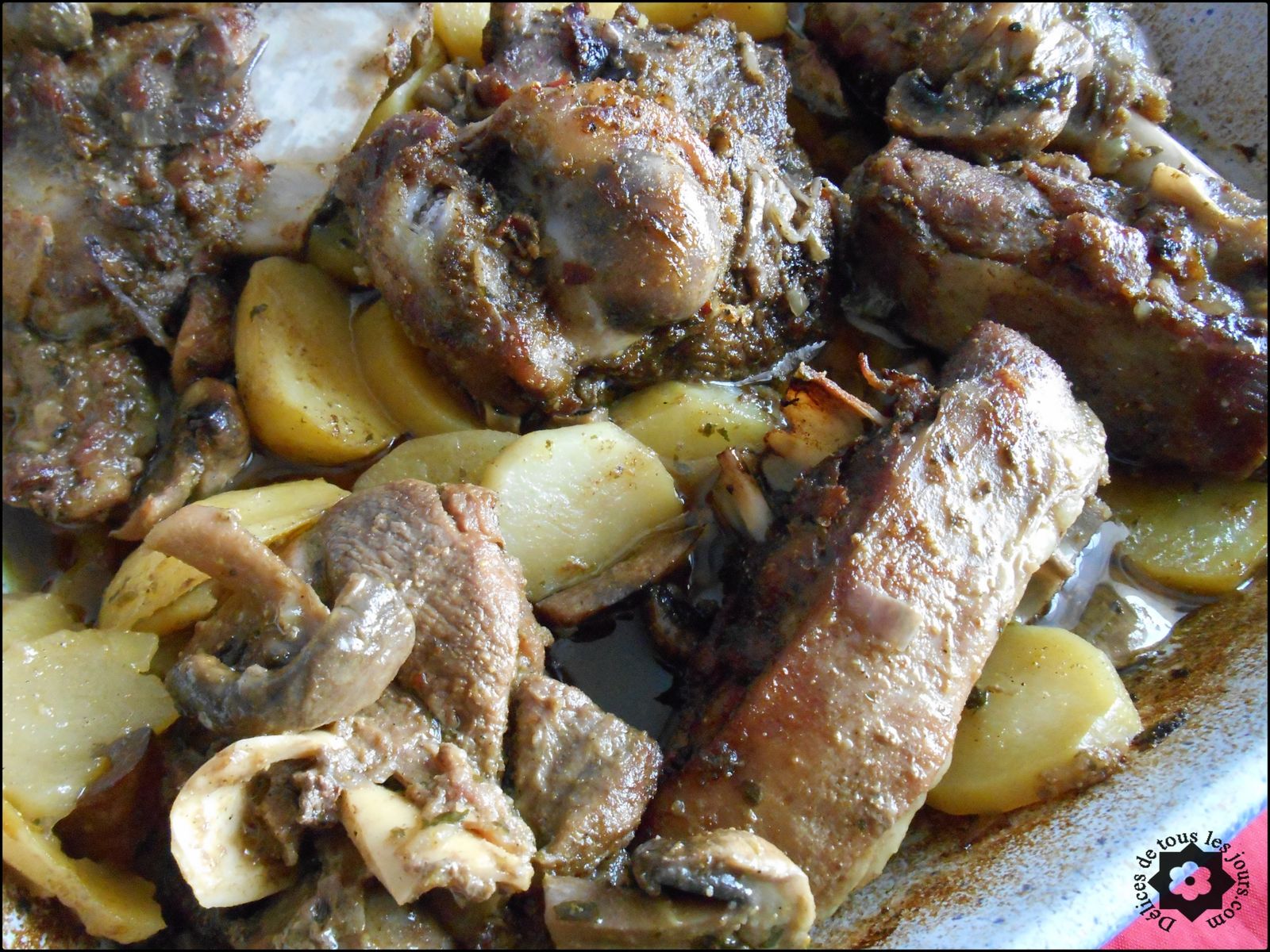 Au bout des 1 heure de cuisson sortez le plat, retirez la viande et mettre les pommes de terre et champignons dans le jus de cuisson, bien mélangez. Reposez la viande par dessus, arrosez là du jus de cuisson et redirection le four pour encore 1 heure toujours à feux doux.