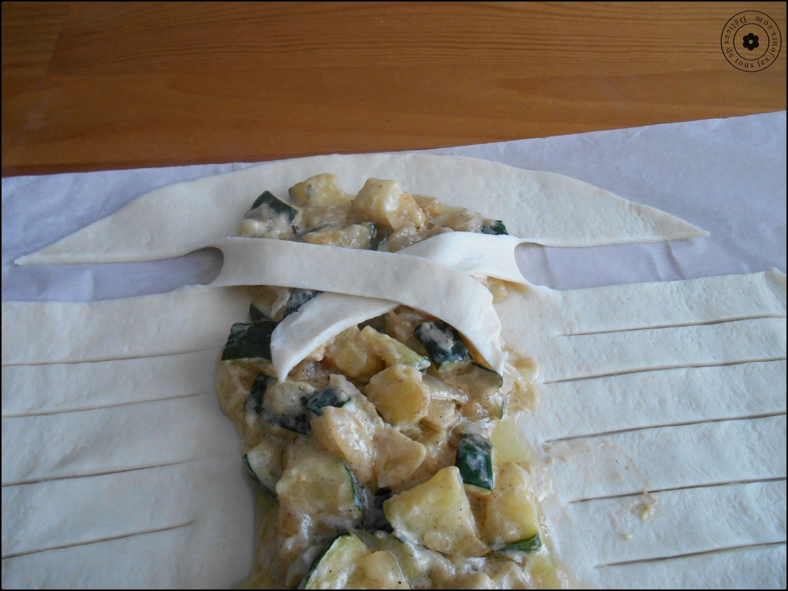Au centre déposez les courgettes, et rabattre les lanières de droite à gauche pour refermer la tourte (cf photos).